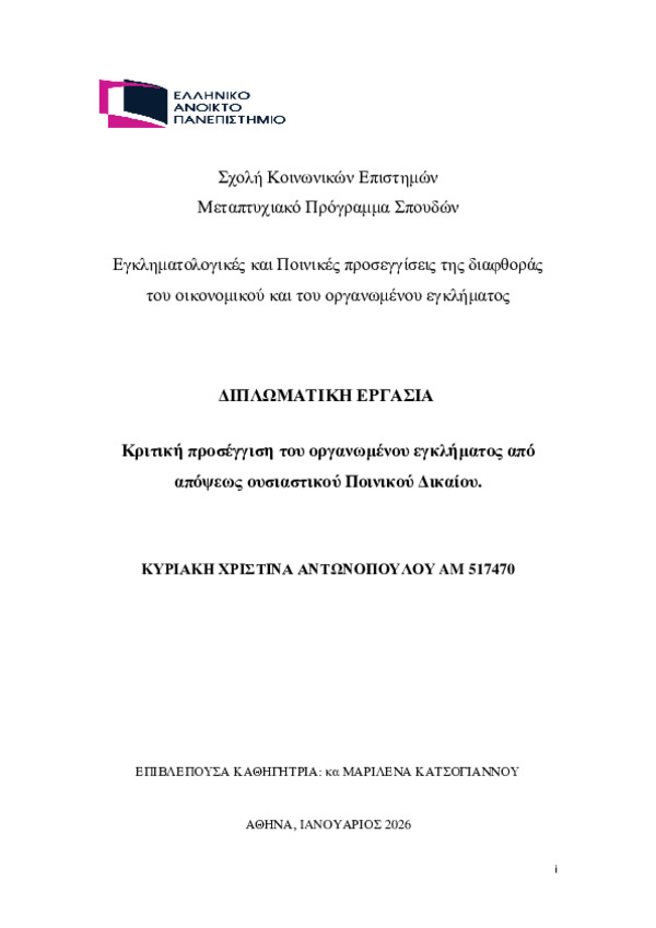 Περίληψη (Abstract): Η παρούσα διπλωματική εργασία πραγματεύεται τις ισχύουσες ποινικές διατάξεις για την καταστολή του οργανωμένου εγκλήματος, την ερμηνεία αυτών, επιχειρεί την υπογράμμιση τυχόν αοριστιών, κενών ή ασαφειών. Περαιτέρω επιχειρείται η ανάδειξη τυχόν συγκρούσεων με άλλες διατάξεις του ποινικού δικαίου, με τις παραδεδεγμένες φιλελεύθερες αρχές ή τις θεμελιώδεις συνταγματικές επιταγές και εν τέλει τη συνολ...