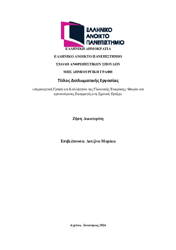 Περίληψη (Abstract): Η παρούσα διπλωματική εργασία εξετάζει τη συμβολή της Δημιουργικής Γραφής στη γλωσσική, γνωστική και συναισθηματική ανάπτυξη των μαθητών του Δημοτικού Σχολείου, μέσα από τη θεωρητική θεμελίωση της δημιουργικότητας και την παιδαγωγική εφαρμογή της στη σύγχρονη σχολική πράξη. Αρχικά παρουσιάζονται βασικές θεωρίες της δημιουργικότητας, όπως οι προσεγγίσεις των Guilford, Torrance, Gardner και Csikszen...