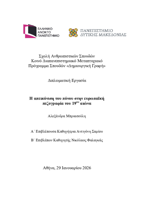 Περίληψη (Abstract): Σκοπός της εργασίας είναι να μελετήσει την απεικόνιση των μορφών πόνου, σωματικού, ψυχικού και κοινωνικού, τις γενεσιουργές αιτίες τους και τις συνέπειες στη συμπεριφορά των ηρώων στα έργα των Ονορέ ντε Μπαλζάκ Ο Εξάδερφος Πονς (1846-1847) Ελίζαμπεθ Γκάσκελ, Μαίρη Μπάρτον (1848), Τσαρλς Ντίκενς, Ο Ζοφερός Οίκος (1852-1853) και Λέοντα Τολστόι Ο Θάνατος του Ιβάν Ιλίτς (1886). Η μεθοδολογία περ...