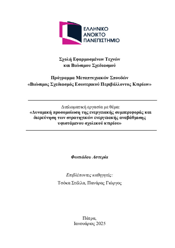 Περίληψη (Abstract): Η ενεργειακή αναβάθμιση των υφιστάμενων κτιρίων αποτελεί κρίσιμη πρόκληση για τη μείωση της κατανάλωσης ενέργειας στον κτιριακό τομέα. Ιδιαίτερα τα σχολικά κτίρια, αν και αντιστοιχούν σε μικρό ποσοστό του συνολικού αποθέματος, έχουν εξαιρετική σημασία λόγω της εκπαιδευτικής τους λειτουργίας και των ευαίσθητων χρηστών που φιλοξενούν. Στο πλαίσιο της παρούσας εργασίας πραγματοποιείται δυναμική προσο...