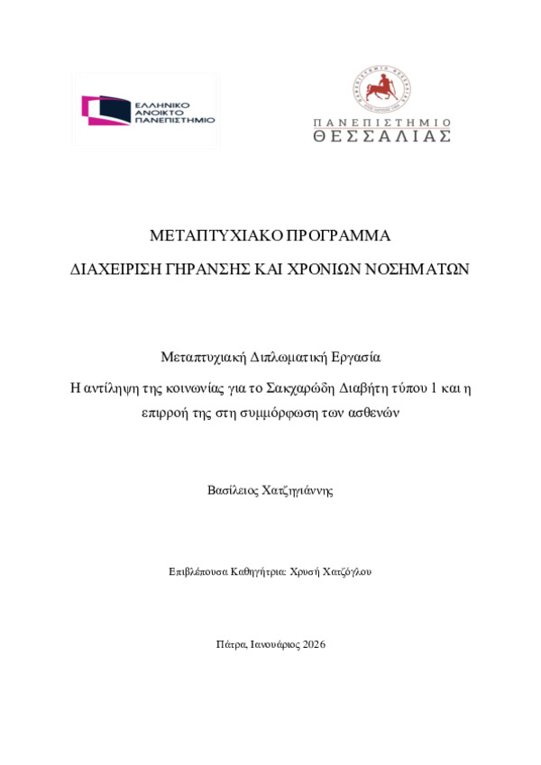 Περίληψη (Abstract): Ο σακχαρώδης διαβήτης τύπου 1 είναι μια χρόνια νόσος που απαιτεί συνεχή διαχείριση και επηρεάζει σημαντικά την ποιότητα ζωής των ατόμων που ζουν με αυτήν. Πέρα από τις ιατρικές προκλήσεις, τα άτομα με σακχαρώδη διαβήτη τύπου 1 συχνά αντιμετωπίζουν κοινωνικό στίγμα και στερεότυπα που επηρεάζουν την ψυχολογική τους ευημερία και την κοινωνική τους ένταξη. Σκοπός της παρούσας βιβλιογραφικής ανασ...