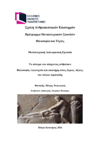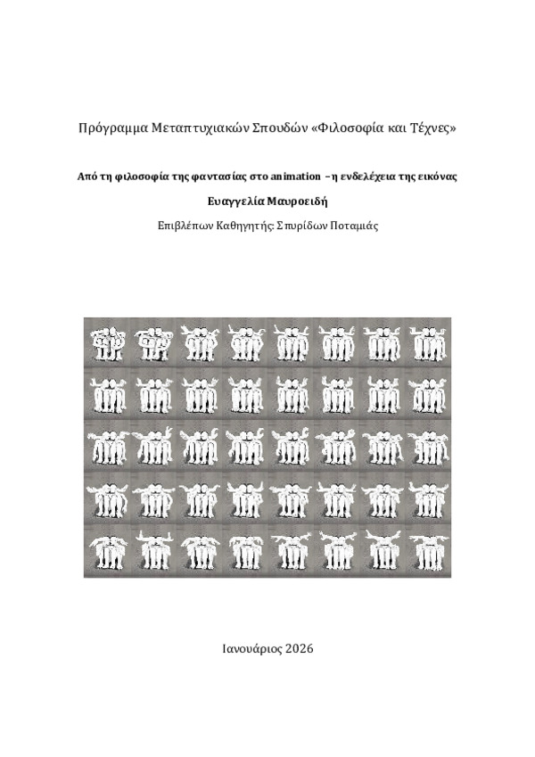 Περίληψη (Abstract): Η παρούσα εργασία εξετάζει τη φαντασία ως φιλοσοφική έννοια και διερευνά τη σχέση της με την εικόνα και ειδικότερα με το animation. Μέσα από μια ιστορική και εννοιολογική διαδρομή, από την αρχαία ελληνική φιλοσοφία ως την συγχρονη νεότερη σκέψη, αναδυκνύεται η φαντασία ως θεμελιώδης γνωστική και δημιουργική λειτουργία της ανθρώπινης συνείδησης. Η μελέτη βασίζεται στη θεωρητική και ερμηνευτική μεθο...