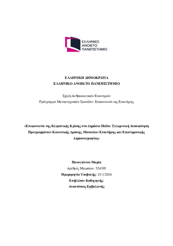 Περίληψη (Abstract): Η κλιματική κρίση συνιστά σύνθετο επιστημονικό και κοινωνικό φαινόμενο, καθιστώντας κρίσιμη τη δημόσια επιστημονική επικοινωνία για τη διαμόρφωση γνώσης, ευαισθητοποίησης και κινητοποίησης του κοινού. Η παρούσα μελέτη διερευνά συγκριτικά τον τρόπο με τον οποίο τρεις βασικοί φορείς επιστημονικής έκθεσης του δημόσιου πεδίου — προγράμματα κοινοτικής δράσης, μουσεία επιστήμης και επιστημονική δημοσιογ...