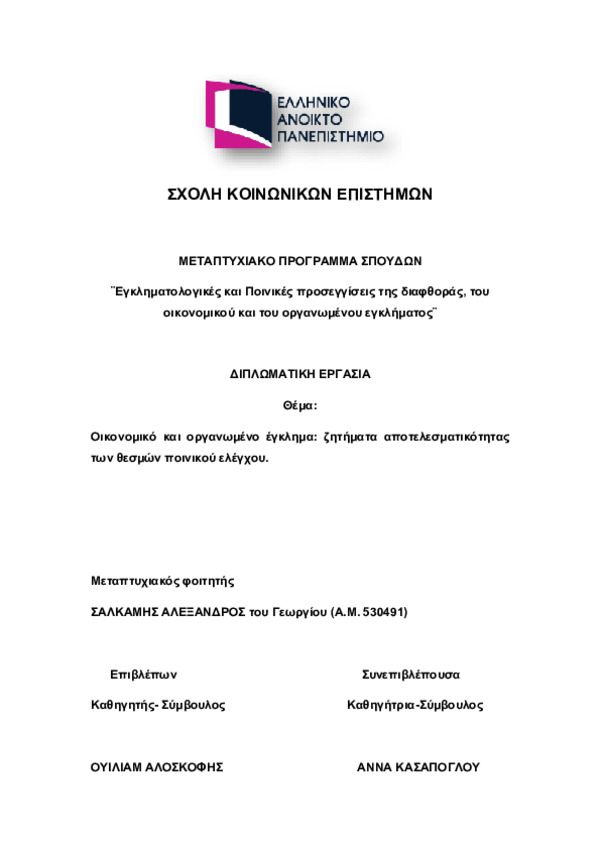Περίληψη (Abstract): Η παρούσα διπλωματική εργασία, έχει ως αντικείμενο της, τη διερεύνηση της αποτελεσματικότητας των θεσμών ποινικών ελέγχου που εμπλέκονται στην ανάσχεση του φαινομένου του οικονομικού και οργανωμένου εγκλήματος. Αρχικά, στο πρώτο μέρος, θα επιχειρηθεί η εννοιολογική προσέγγιση της οικονομικής εγκληματικότητας μέσα από τις υπάρχουσες εγκληματολογικές θεωρίες και θα γίνει μία ιστορική αναδρομή στην ε...