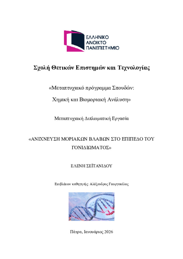 Περίληψη (Abstract): Η ανίχνευση και αναγνώριση των μοριακών βλαβών στο γονιδίωμα είναι καθοριστικήςσημασίας, καθώς συμβάλλει στην κατανόηση της γενετικής βάσης των ασθενειών, αλλά καιστην ανάπτυξη κατάλληλων μεθόδων διάγνωσης και θεραπείας. Την επανάσταση στη μοριακήδιαγνωστική αποτέλεσε η αλληλούχηση Sanger, η οποία επέτρεψε τον προσδιορισμό τηςαλληλουχίας του DNA. Έκτοτε, η ραγδαία εξέλιξη των τεχνολογιών αλληλούχη...