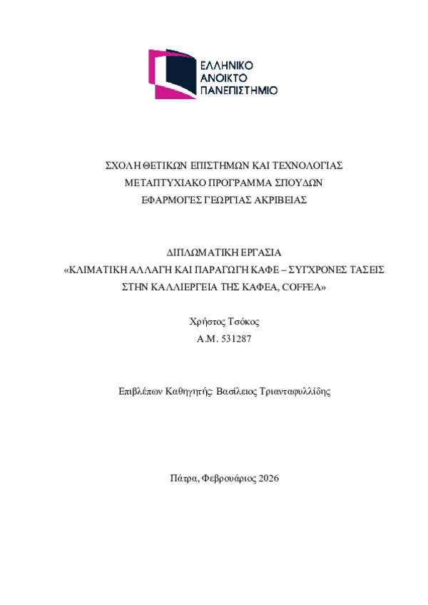 Περίληψη (Abstract): Η καλλιέργεια του καφέ αποτελεί μία από τις σημαντικότερες γεωργικές δραστηριότητες σε παγκόσμιο επίπεδο, παρουσιάζοντας έντονη ευαισθησία στις επιπτώσεις της κλιματικής αλλαγής. Η αύξηση της θερμοκρασίας, η μεταβολή των βροχοπτώσεων και η συχνότερη εμφάνιση ακραίων καιρικών φαινομένων επηρεάζουν άμεσα την παραγωγικότητα, την ποιότητα και τη γεωγραφική κατανομή των καλλιεργειών καφέ, ιδιαίτερα της...