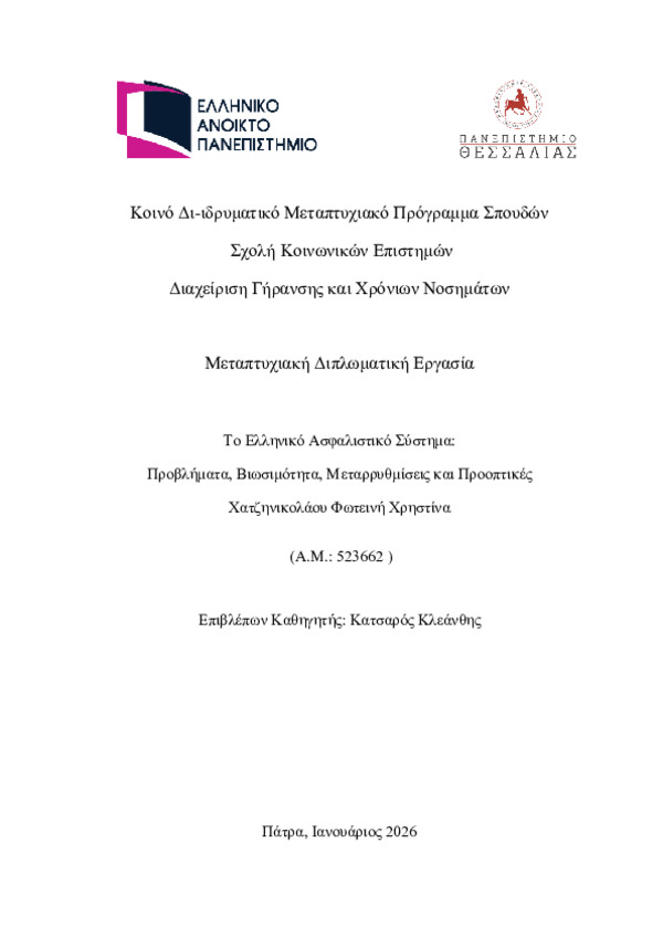 Περίληψη (Abstract): Το ελληνικό ασφαλιστικό σύστημα αποτελεί έναν από τους σημαντικότερους πυλώνες του κράτους πρόνοιας, διαδραματίζοντας κεντρικό ρόλο στην κοινωνική προστασία και την οικονομική σταθερότητα. Η παρούσα βιβλιογραφική εργασία εξετάζει το ελληνικό ασφαλιστικό σύστημα υπό το πρίσμα των ιστορικών του καταβολών, των διαρθρωτικών του προβλημάτων, των μεταρρυθμίσεων που υλοποιήθηκαν τις τελευταίες δεκαετίες ...