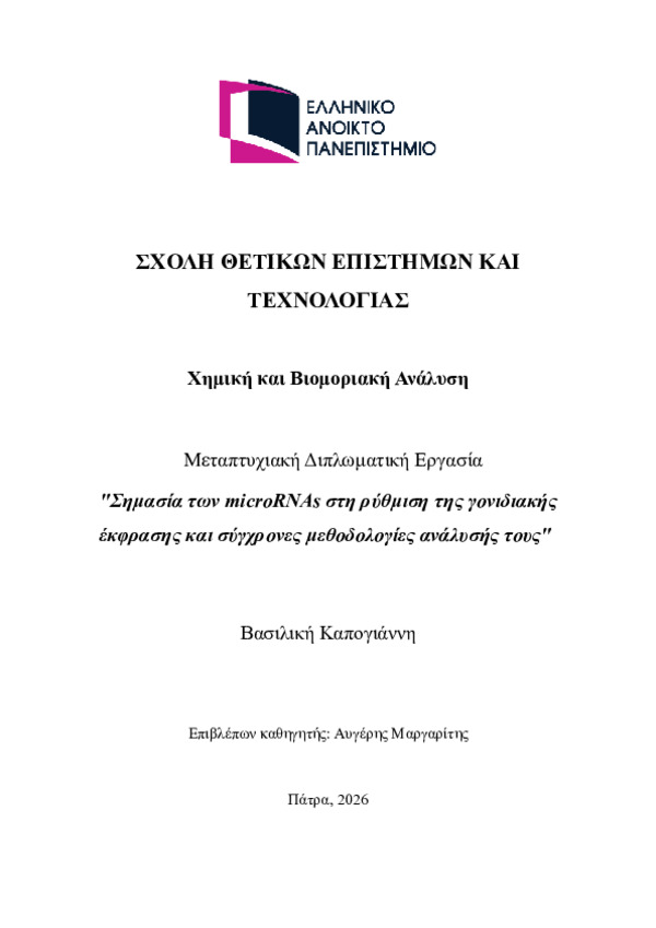Περίληψη (Abstract): Τα microRNAs (miRNAs) αποτελούν μια εκτεταμένη κατηγορία μικρών μη κωδικών RNA που δρουν ως βασικοί ρυθμιστές της γονιδιακής έκφρασης σε μετα-μεταγραφικό επίπεδο. Μέσω της ειδικής αλληλεπίδρασής τους με συμπληρωματικές αλληλουχίες mRNA, τα miRNAs ελέγχουν τη σταθερότητα και τη μεταφραστική δραστηριότητα των στόχων τους, συμβάλλοντας καθοριστικά στη ρύθμιση θεμελιωδών κυτταρικών διεργασιών, όπως η ...