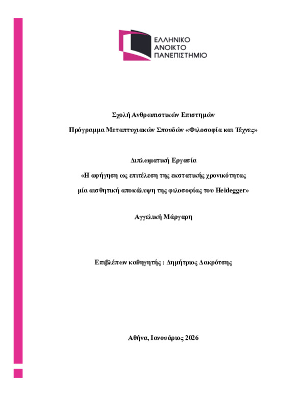 Περίληψη (Abstract): Η εργασία διερευνά πώς η αφήγηση, ως φιλοσοφική και αισθητική πρακτική, λειτουργεί ως τρόπος ποιητικού κατοικεῖν που διαπραγματεύεται την ανθρώπινη εμπειρία του χρόνου: όχι ως απλή αναπαράσταση μιας χρονικής διαδοχής, αλλά ως συμβάν μορφοποίησης, όπου ο χρόνος γίνεται ορατός, λέγεται και αναλαμβάνεται. Κεντρική υπόθεση είναι ότι η χαϊντεγκεριανή εκστατική χρονικότητα—παρότι θεμελιώδης για την κατα...