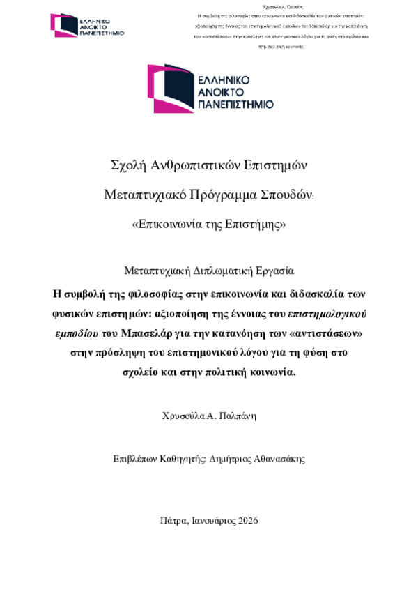 Περίληψη (Abstract): Η εμπλοκή των ατόμων σε διαδικασίες συμπαραγωγής επιστημονικής γνώσης βασίζεται στην αξιολόγηση της αξιοπιστίας επιστημονικών ισχυρισμών για την προσωπική και κυρίως τη δημόσια λήψη αποφάσεων. Στο πλαίσιο της ενίσχυσης του ατόμου στη συμμετοχή στα διάφορα πεδία εντός των οποίων επικοινωνείται η επιστήμη στην επιστημονική πολιτεία, το έργο του Μπασελάρ ευρύτερα αλλά ειδικότερα η έννοια των επιστημο...