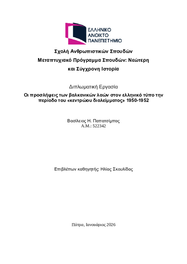 Περίληψη (Abstract): Η παρούσα διπλωματική εργασία εξετάζει τις προσλήψεις των βαλκανικών λαών στον ελληνικό Τύπο κατά την περίοδο 1950-1952, η οποία ταυτίζεται ιστορικά με το «κεντρώο διάλειμμα». Σκοπός της έρευνας είναι να αναδείξει πώς οι εφημερίδες της εποχής προσέλαβαν και παρουσίασαν τις γεωπολιτικές ανακατατάξεις στη βαλκανική χερσόνησο στο πλαίσιο του πρώιμου Ψυχρού Πολέμου.Η μελέτη βασίζεται στην πρωτογενή έρ...