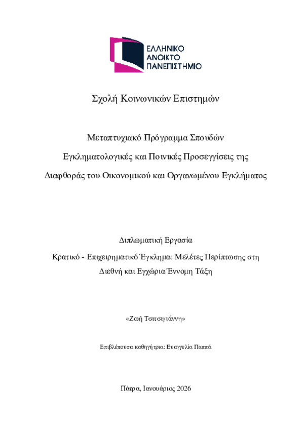 Περίληψη (Abstract): Η παρούσα διπλωματική εργασία, έχει ως αντικείμενο της, τη διερεύνηση της αποτελεσματικότητας των θεσμών ποινικών ελέγχου που εμπλέκονται στην ανάσχεση του φαινομένου του οικονομικού και οργανωμένου εγκλήματος. Αρχικά, στο πρώτο μέρος, θα επιχειρηθεί η εννοιολογική προσέγγιση της οικονομικής εγκληματικότητας μέσα από τις υπάρχουσες εγκληματολογικές θεωρίες και θα γίνει μία ιστορική αναδρομή στην ε...