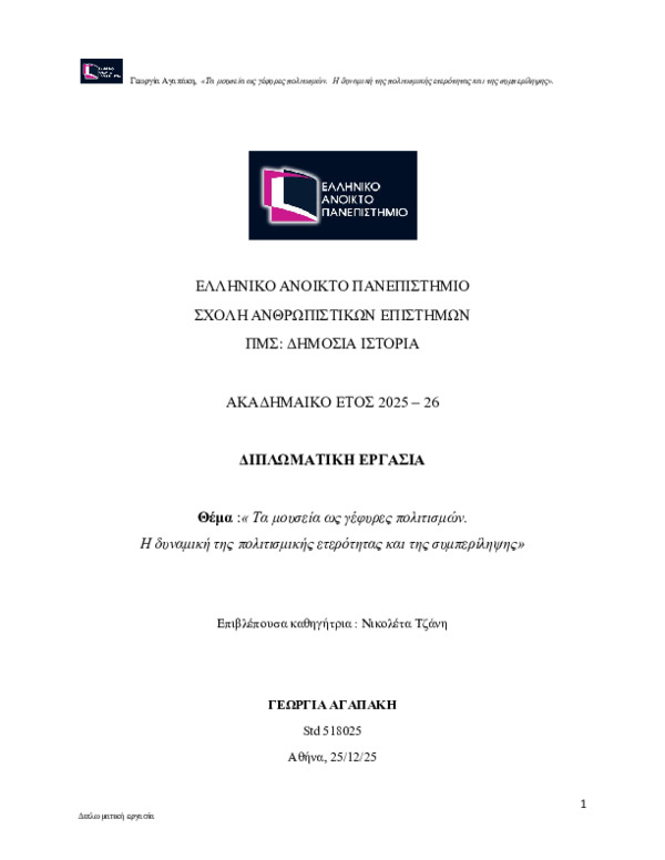 Περίληψη (Abstract): Η παρούσα εργασία εξετάζει τον ρόλο των μουσείων ως φορέων πολιτισμικού διαλόγου και κοινωνικής συνοχής στο πλαίσιο της πολυπολιτισμικής κοινωνίας. Εστιάζοντας στη σύγχρονη πραγματικότητα, διερευνά πώς τα μουσεία μπορούν να λειτουργήσουν ως " γέφυρες πολιτισμών" συμβάλλοντας στην αναγνώριση της πολιτισμικής ετερότητας και στην αντιμετώπιση του κοινωνικού αποκλεισμού. Το θεωρητικό πλαίσιο αρθρώνετα...