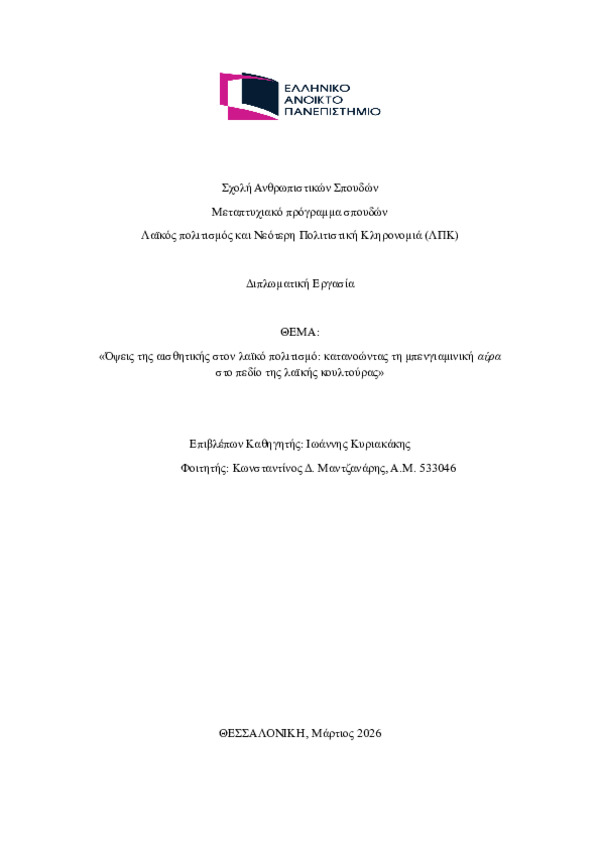 Περίληψη (Abstract): Στην ανά χείρας μελέτη επιχειρούμε μια διεπιστημονική προσέγγιση της φιλοσοφικής σκέψης του Walter Benjamin επί του λαϊκού πολιτισμού. Περισσότερο ειδικά εξετάζουμε την έννοια της μπενγιαμινικής αύρας ως προς τον ρόλο που διαδραματίζει σε επιμέρους όψεις εκφράσεις της λαϊκής παράδοσης. Συζητάμε δηλαδή τον τρόπο με τον οποίο η μπενγιαμινική αύρα θέτει ένα φιλοσοφικό ερώτημα ή διάσταση που χρειάζετα...