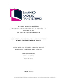 Περίληψη (Abstract): Η παρούσα διπλωματική εργασία διερευνά την θεσμική, νομική και ηθική διάσταση του υποχρεωτικού εμβολιασμού, εστιάζοντας στο ελληνικό ρυθμιστικό πλαίσιο, αλλά και σε νομοθετικές διατάξεις άλλων χωρών υπό το πρίσμα του συγκριτικού δικαίου. Η μελέτη στοχεύει στην ανάδειξη της σύνθετης ισορροπίας ανάμεσα στην προστασία της δημόσιας υγείας και τον σεβασμό των θεμελιωδών ανθρωπίνων δικαιωμάτων, όπω...