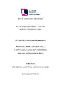 Περίληψη (Abstract): Η παρούσα διπλωματική εργασία διερευνά τις εμπειρίες, τις αντιλήψεις και τις ανάγκες γονέων παιδιών προσχολικής ηλικίας αναφορικά με την ψυχοεκπαίδευση, καθώς και τη συμβολή της στην οικογενειακή ευημερία και την προαγωγή της δημόσιας υγείας. Η προσχολική ηλικία αποτελεί κρίσιμη αναπτυξιακή περίοδο, κατά την οποία οι γονείς καλούνται να διαχειριστούν αυξημένες απαιτήσεις και προκλήσεις, γεγονός πο...
