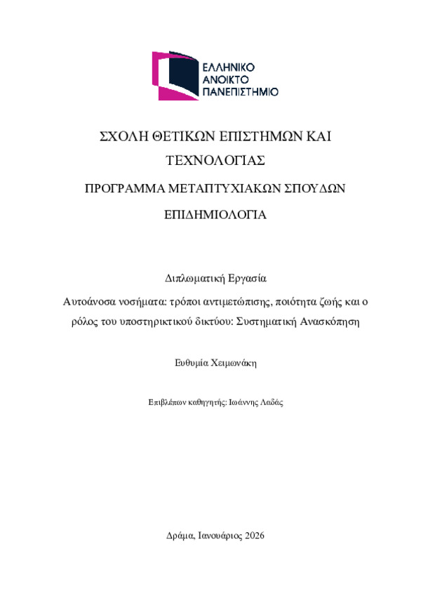 Περίληψη (Abstract): Τα αυτοάνοσα νοσήματα αποτελούν χρόνιες παθήσεις με μεγάλη ετερογένεια ως προς την κλινική εικόνα και την πορεία τους. Κοινό τους χαρακτηριστικό είναι η διαταραχή της λειτουργίας του ανοσοποιητικού συστήματος, η οποία οδηγεί σε προσβολή ιστών ή οργάνων του ίδιου του οργανισμού. Παρά τις βελτιώσεις που έχουν σημειωθεί τα τελευταία χρόνια στη διάγνωση και στη θεραπεία, η καθημερινή ζωή των ασθενών σ...