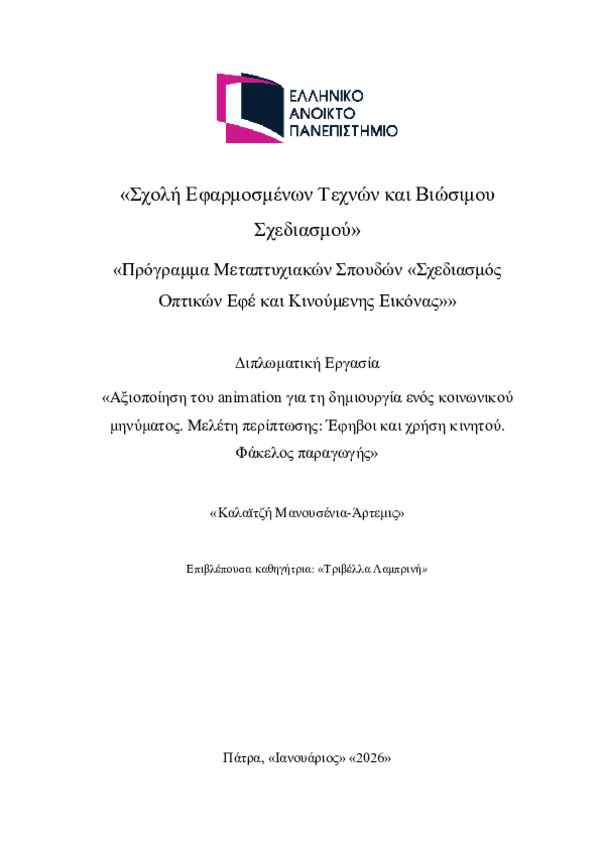 Περίληψη (Abstract): Η παρούσα διπλωματική εργασία εξετάζει το ζήτημα της υπερβολικής χρήσης των κινητών τηλεφώνων από τους εφήβους και διερευνά τον ρόλο που μπορεί να έχει ένα κοινωνικό μήνυμα σε μορφή animation στην ευαισθητοποίηση γύρω από το φαινόμενο της εξάρτησης. Σκοπός της εργασίας είναι η δημιουργία και αξιολόγηση της ταινίας animation «Το Smartphone», με στόχο να αποτυπωθεί η σχέση των νέων με το κινητό και ...