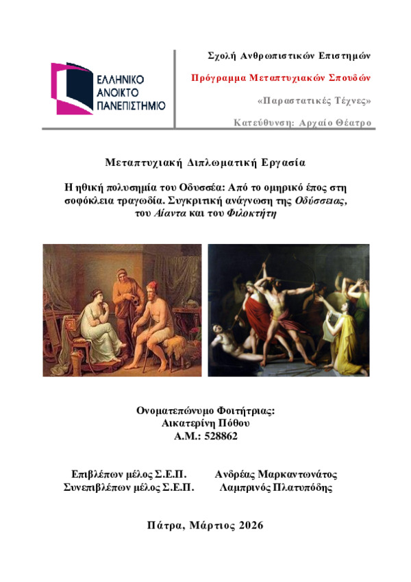 Περίληψη (Abstract): Ο Οδυσσέας συγκαταλέγεται στους πλέον πολυδιάστατους και ηθικά σύνθετους χαρακτήρες της αρχαίας ελληνικής γραμματείας, καθώς η μορφή του αποτυπώνει με ιδιαίτερη σαφήνεια τη διαρκή ένταση ανάμεσα στην αρετή και στις εγγενείς αδυναμίες της ανθρώπινης φύσης. Στην Οδύσσεια, ο ομηρικός ήρωας σκιαγραφείται ως φορέας ιδιαίτερης ευφυΐας, επινοητικότητας και στρατηγικής δεξιότητας, ενώ παράλληλα, η δράση τ...