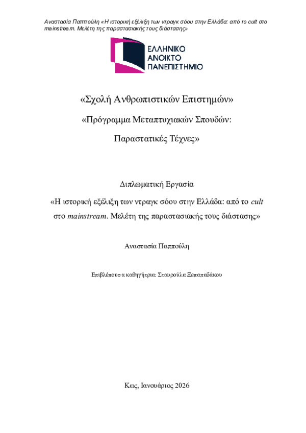 Περίληψη (Abstract): Η παρούσα διπλωματική εργασία εξετάζει την ιστορική εξέλιξη και την καλλιτεχνική διάσταση των ντραγκ σόου στην Ελλάδα, χαρτογραφώντας τη μετάβασή τους από το περιθώριο σε μια ευρέως αποδεκτή μορφή επιτελεστικής έκφρασης. Το ντραγκ προσεγγίζεται όχι μόνο ως μέσο ψυχαγωγίας, αλλά και ως ένα πολυσύνθετο κοινωνικοπολιτισμικό και καλλιτεχνικό φαινόμενο, άρρηκτα συνδεδεμένο με ζητήματα φύλου, ταυτότητας...