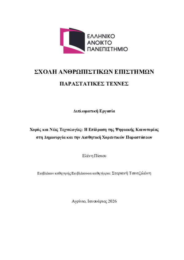 Περίληψη (Abstract): Η παρούσα διπλωματική εργασία διερευνά τη σχέση του σύγχρονου χορού με τις νέες ψηφιακές τεχνολογίες, εστιάζοντας στον τρόπο με τον οποίο η ψηφιακή καινοτομία επηρεάζει τη χορογραφική δημιουργία, την αισθητική των χορευτικών παραστάσεων και τη διαδικασία θέασής τους. Αφετηρία της μελέτης αποτελεί η θεωρητική προσέγγιση των βασικών στοιχείων του χορού, σώμα, χώρος και χρόνος, και ο επαναπροσδιορισμ...