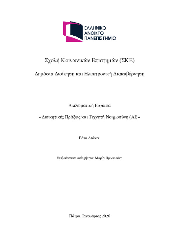 Περίληψη (Abstract): Η παρούσα εργασία εξετάζει τη σχέση μεταξύ της Τεχνητής Νοημοσύνης (ΤΝ) και της διοικητικής πράξης, εστιάζοντας στις νομικές προκλήσεις που ανακύπτουν από τη χρήση αλγοριθμικών συστημάτων στη διαδικασία λήψης διοικητικών αποφάσεων. Η ενσωμάτωση τεχνολογιών ΤΝ στη δημόσια διοίκηση συνιστά εξέλιξη με σημαντικές επιπτώσεις στον τρόπο άσκησης της δημόσιας εξουσίας, καθώς επηρεάζει τον χαρακτήρα της δι...