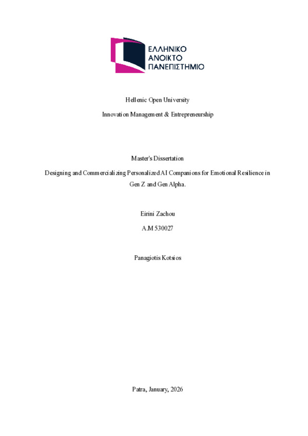 Σχεδιασµός και Εµπορευµατοποίηση Εξατοµικευµένων Συντρόφων Τεχνητής Νοηµοσύνης (AI Companions) για τη Συναισθηµατική Ανθεκτικότητα των Γενεών Z και Alpha. [Ελληνική]
