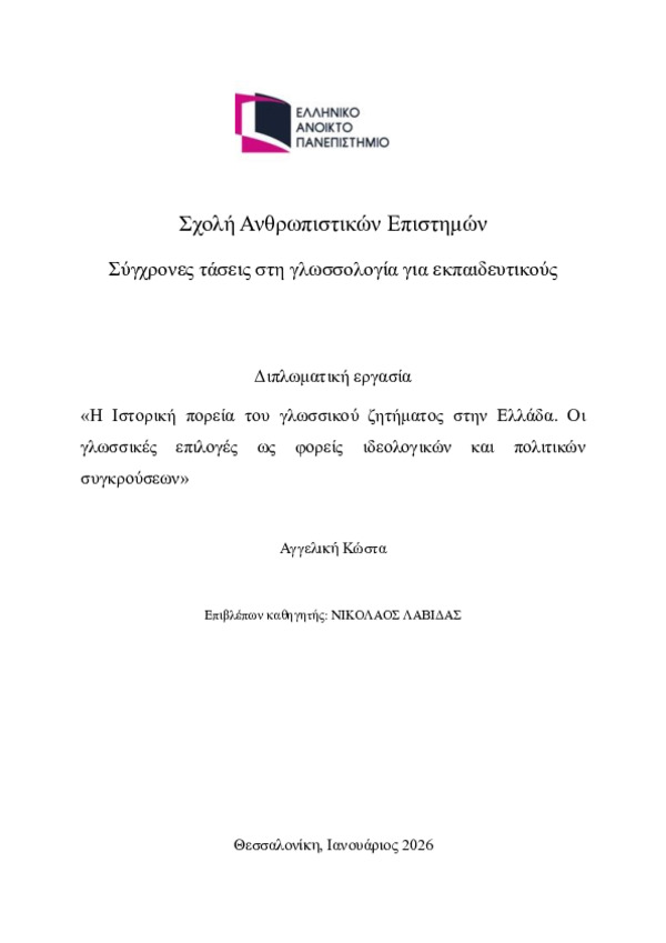 Περίληψη (Abstract): Στην παρούσα εργασία αναλύεται η ιστορική πορεία του γλωσσικού ζητήματος στην Ελλάδα και ο τρόπος με τον οποίο οι γλωσσικές επιλογές αποτέλεσαν πεδίο ιδεολογικών και πολιτικών συγκρούσεων. Οι ιστορικές ρίζες του γλωσσικού ζητήματος ανάγονται στον 1ο αιώνα π.Χ. όταν εμφανίστηκε για πρώτη φορά ο Αττικισμός, η στροφή στην αττική διάλεκτο του 4ου και 5ου αιώνα π.Χ. Η διγλωσσία συνεχίστηκε στο Βυζάντιο...