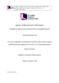 Περίληψη (Abstract): Στην παρούσα εργασία διερευνώνται οι απόψεις, οι στάσεις και οι διδακτικές πρακτικές εκπαιδευτικών προσχολικής ηλικίας, καθώς και οι προκλήσεις που αντιμετωπίζουν κατά τη διδασκαλία σε τάξεις με δίγλωσσους μαθητές. Κεντρικό ζήτημα αποτελεί η σημασία της πρώτης γλώσσας και της πολυγλωσσίας για τη γλωσσική ανάπτυξη, την κοινωνική ένταξη και τη μάθηση της ελληνικής ως δεύτερης γλώσσας. Η θετική στάση...