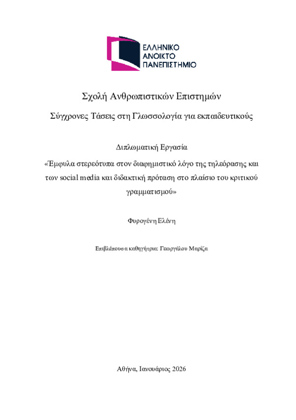 Περίληψη (Abstract): Η παρούσα μεταπτυχιακή εργασία διερευνά κριτικά τις αναπαραστάσεις της αναπηρίας στον σύγχρονο ελληνικό δημόσιο λόγο και στα κείμενα μαζικής κουλτούρας, εστιάζοντας στον τρόπο με τον οποίο η αναπηρία κατασκευάζεται κοινωνικά μέσα από γλωσσικές και πολυτροπικές πρακτικές. Βασικός στόχος της έρευνας είναι να αναδείξει πώς η αναπηρία νοηματοδοτείται όχι ως ουδέτερη περιγραφική κατηγορία, αλλά ως ιδεο...