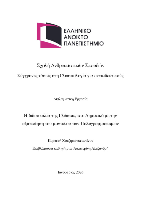 Περίληψη (Abstract): Η παρούσα διπλωματική εργασία ασχολείται με την αξιοποίηση του μοντέλου των Πολυγραμματισμών και της Νέας Μάθησης μέσω Σχεδιασμού στο πλαίσιο της διδασκαλίας της Νέας ελληνικής γλώσσας στο δημοτικό Σχολείο. Στόχος της είναι να αναδείξει την αναγκαιότητα και τη χρησιμότητα των συγκεκριμένων παιδαγωγικών μοντέλων στη σύγχρονη εκπαιδευτική πραγματικότητα, καθώς συμβάλλουν στην ανάπτυξη δεξιοτήτων κατ...