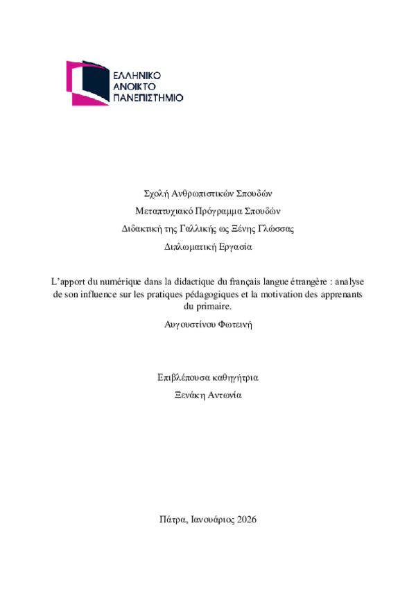 Περίληψη (Abstract): Cette thèse s’intéresse sur le rôle et la place du numérique dans l'enseignement du français langue étrangère (FLE) à l'école primaire, en se basant sur les perceptions et les méthodes des enseignants. Dans un contexte de digitalisation de l'éducation, cette étude a pour but d'examiner comment l'incorporation des technologies de l'information et de la communication dans l'enseignement (TICE) affec...