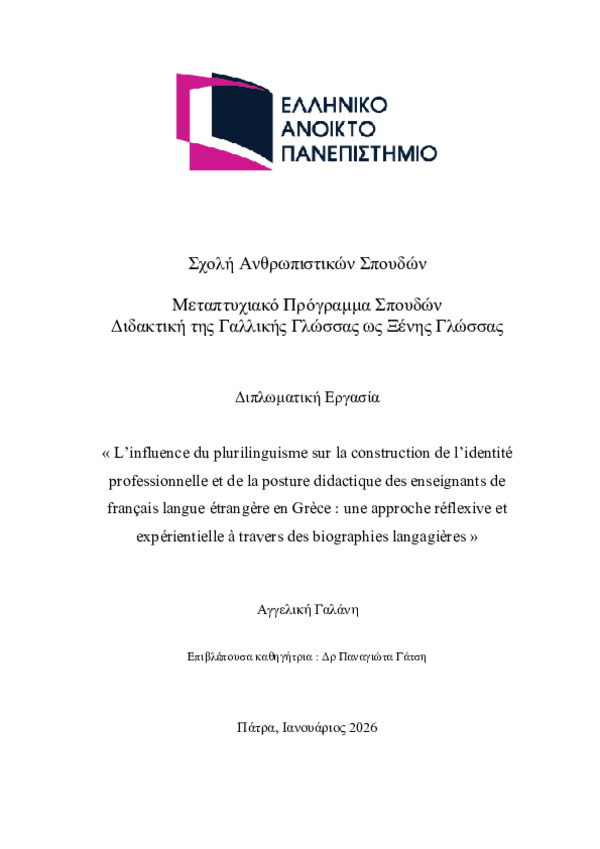 Περίληψη (Abstract): Ce mémoire s’inscrit dans le champ de la didactique des langues et se concentre sur le rôle du plurilinguisme vécu dans la construction de l’identité professionnelle et de la posture didactique des enseignants de français langue étrangère (FLE) en Grèce. Dans un contexte éducatif marqué par une diversité linguistique et culturelle croissante, cette recherche vise à mettre en lumière la manière don...