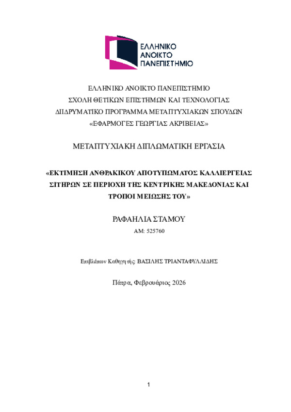 Περίληψη (Abstract): Η παρούσα διπλωματική εργασία εστιάζει στη συστηματική ποσοτικοποίηση και ανάλυση του ανθρακικού αποτυπώματος της καλλιέργειας σιτηρών σε περιοχές της Κεντρικής Μακεδονίας, με στόχο την κατανόηση των παραγόντων που συμβάλλουν στις εκπομπές αερίων του θερμοκηπίου και τη διερεύνηση πρακτικών μείωσής τους χωρίς αρνητικές επιπτώσεις στην παραγωγικότητα. Η μελέτη εντάσσεται στο ευρύτερο πλαίσιο της βιώ...