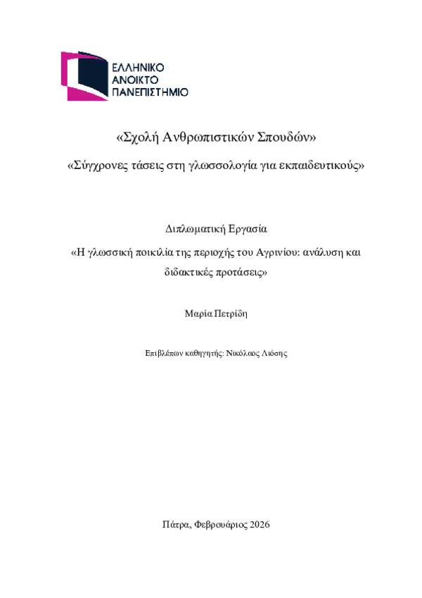 Περίληψη (Abstract): Η εν λόγω διπλωματική εργασία εκπονείται στα πλαίσια του μεταπτυχιακού προγράμματος σπουδών «Σύγχρονες τάσεις της γλωσσολογίας για εκπαιδευτικούς» και έχει τίτλο «Η γλωσσική ποικιλία της περιοχής του Αγρινίου: ανάλυση και διδακτικές προτάσεις». Στόχος της είναι να συμβάλλει στη συζήτηση περί γλωσσικής ποικιλότητας και ιδιαίτερα να εστιάσει στη γλωσσική ποικιλία της περιοχής του Αγρινίου και στον τ...