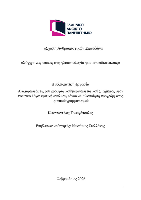 Περίληψη (Abstract): Τις τελευταίες δεκαετίες υπό το φακό της Κριτικής Ανάλυσης Λόγου ο πολιτικός και δη ο κοινοβουλευτικός λόγος για το προσφυγικό και μεταναστευτικό θέμα αντιμετωπίζεται με κριτική ματιά ως η κατεξοχήν κοινωνική πρακτική η οποία στη δημόσια σφαίρα ευθύνεται για την αναπαραγωγή, κατασκευή και διαιώνιση στάσεων, πεποιθήσεων, προκαταλήψεων εις βάρος μειονοτήτων όπως οι πρόσφυγες και οι μετανάστες. Στην ...