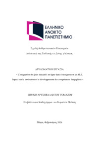 Περίληψη (Abstract): Le présent mémoire explore l’intégration des jeux éducatifs en ligne dans l’enseignement du français langue étrangère (FLE) au niveau du primaire et examine leur impact sur la motivation et le développement des compétences langagières des élèves. L’étude part du postulat que l’apprentissage par le jeu constitue une approche pédagogique efficace, favorisant à la fois l’engagement actif des apprenan...