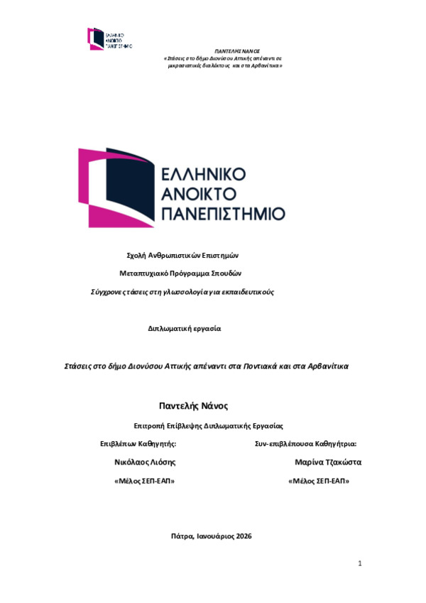 Περίληψη (Abstract): Η συγκεκριμένη διπλωματική εργασία έχει θέμα «Στάσεις στο δήμο Διονύσου Αττικής απέναντι στα Ποντιακά και στα Αρβανίτικα». Ο δήμος Διονύσου έχει κατοίκους ποντιακής και αρβανίτικης καταγωγής διαφορετικών γενεών. Αντικείμενο της εργασίας είναι η διερεύνηση των γλωσσικών και ιδεολογικών στάσεων τους απέναντι στην Ποντιακή διάλεκτο και στην Αρβανίτικη μειονοτική γλώσσα. Στόχος είναι να δι...