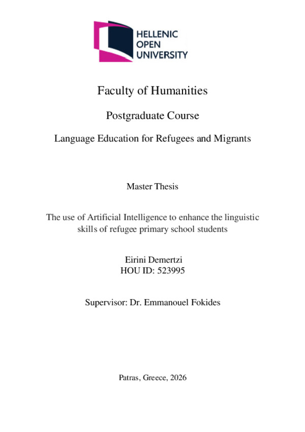 Η χρήση της Τεχνητής Νοημοσύνης για την ενίσχυση των γλωσσικών δεξιοτήτων προσφύγων μαθητών στην πρωτοβάθμια εκπαίδευση [Ελληνική]