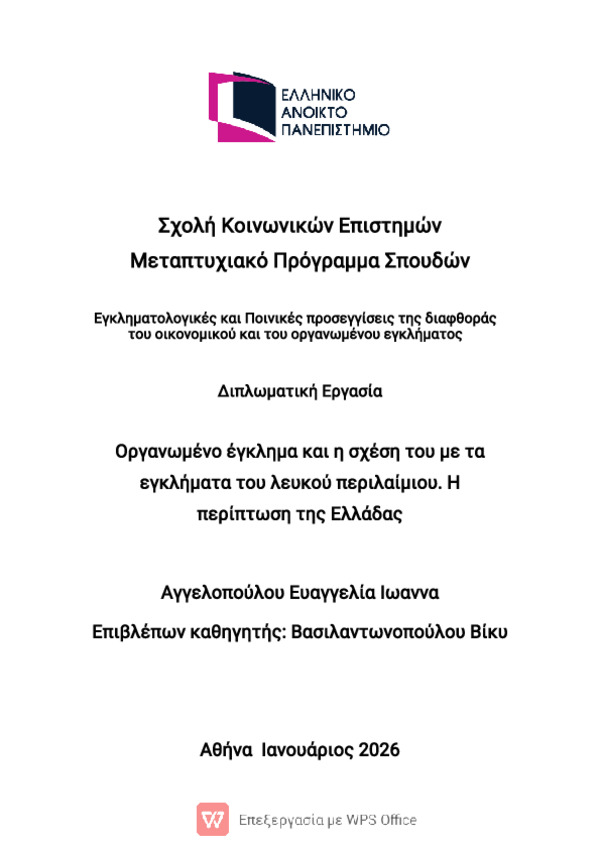 Περίληψη (Abstract): Η παρούσα εργασία εξετάζει τη σχέση και τη διασύνδεση μεταξύ του οργανωμένου εγκλήματος και των εγκλημάτων του λευκού περιλαιμιου, αναδεικνύοντας τις κοινές τους δομές, τους μηχανισμούς αλληλεπίδρασης και τις κοινωνικοοικονομικές τους επιπτώσεις. Αρχικά, παρουσιάζεται το εννοιολογικό και θεωρητικό πλαίσιο των δύο μορφών εγκληματικότητας, με έμφαση στις βασικές εγκληματολογικες θεωρίες, στον ορισμό...