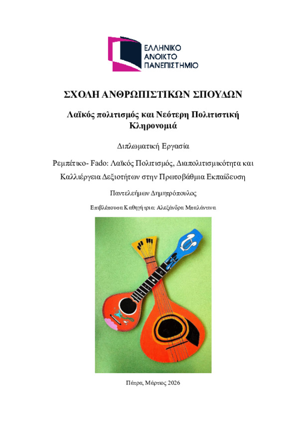 Περίληψη (Abstract): Η παρούσα διπλωματική εργασία πραγματεύεται τη δημιουργία και εφαρμογή ενός διαπολιτισμικού εκπαιδευτικού σχεδίου εργασίας λαϊκού μουσικού πολιτισμού. Το πρόγραμμα εφαρμόστηκε από τον γράφοντα σε Δημοτικό Σχολείο των βορείων προαστίων Αττικής, έχει τίτλο Το ελληνικό ρεμπέτικο τραγούδι συνομιλεί με το πορτογαλικό fado και αφορά την καλλιέργεια δεξιοτήτων σε μαθητές/τριες της ΣΤ’ Δημοτικού. Η εργασί...