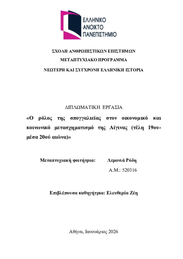 Περίληψη (Abstract): Στην παρούσα εργασία διερευνάται η συμβολή της σπογγαλιευτικής δραστηριότητας που αναπτύχθηκε στην Αίγινα από τα τέλη του 19ου έως τα μέσα του 20ού αιώνα στον οικονομικό και κοινωνικό μετασχηματισμό της νήσου. Αναλύεται ο ρόλος της σπογγαλιείας ως εξαγωγικού και πλουτοπαραγωγικού κλάδου, καθώς και η καθοριστική σημασία της τεχνολογικής καινοτομίας του σκάφανδρου στον μετασχηματισμό της σπογγαλιεία...