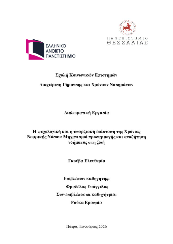 Περίληψη (Abstract): Εισαγωγή: Η Χρόνια Νεφρική Νόσος (ΧΝΝ) αποτελεί μία από τις πλέον απαιτητικές και επιβαρυντικές ιατρικές καταστάσεις, καθώς συνοδεύεται από εκτεταμένες βιολογικές επιπτώσεις, αλλά και από σημαντικές ψυχολογικές και υπαρξιακές προκλήσεις για τους ασθενείς. Σκοπός: Η παρούσα εργασία διερευνά την ψυχολογική και υπαρξιακή διάσταση της ΧΝΝ, δίνοντας ιδιαίτερη έμφαση στους μηχανισμούς προσαρμογής που εν...