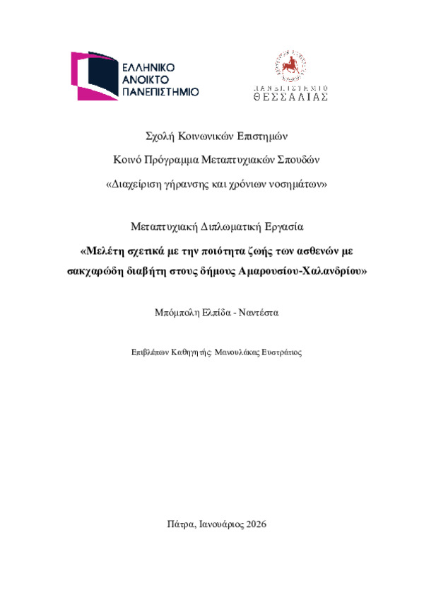 Περίληψη (Abstract): Ο σακχαρώδης διαβήτης αποτελεί ένα από τα συχνότερα χρόνια νοσήματα και συνδέεται με σημαντικές επιπτώσεις στην ποιότητα ζωής των ασθενών, επηρεάζοντας τόσο τη σωματική όσο και την ψυχολογική και κοινωνική τους λειτουργικότητα. Η αξιολόγηση της ποιότητας ζωής είναι αναγκαία τόσο για την κατανόηση των αναγκών των ασθενών όσο και για τη βελτίωση των θεραπευτικών σχημάτων και των υπηρεσιών υγείας. Σκ...
