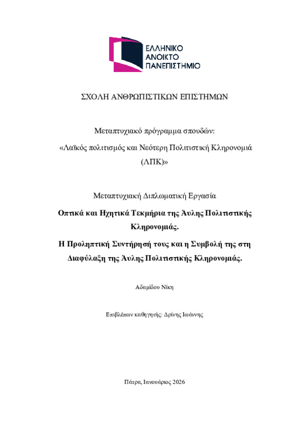 Περίληψη (Abstract): Η παρούσα μεταπτυχιακή διατριβή εξετάζει τις οπτικές και ακουστικές καταγραφές της Άυλης Πολιτιστικής Κληρονομιάς, εστιάζοντας στο ρόλο των οπτικοακουστικών μέσων ως φορέων πολιτισμικής πληροφορίας και στη συμβολή της προληπτικής διατήρησής τους στη διαφύλαξή της. Αρχικά, αναπτύσσεται το θεωρητικό και μεθοδολογικό πλαίσιο της έρευνας, με αναφορά στη σχέση μεταξύ διαφύλαξης, διατήρησης και κοινότητ...