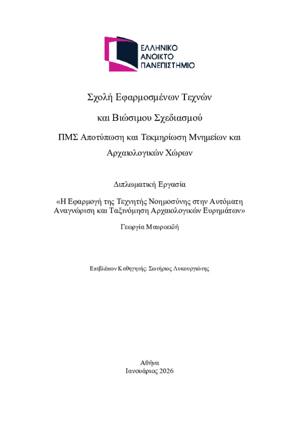Περίληψη (Abstract): Η παρούσα διπλωματική εργασία διερευνά την εφαρμογή της τεχνητής νοημοσύνης στην αρχαιολογική επιστήμη με έμφαση στην αναγνώριση και ταξινόμηση αρχαιοτήτων. Η μελέτη στοχεύει στην ανάδειξη του τρόπου με τον οποίο τα σύγχρονα υπολογιστικά μοντέλα υποστηρίζουν κι ενισχύουν παραδοσιακές αρχαιολογικές πρακτικές. Στο πρώτο μέρος της εργασίας παρουσιάζεται γραμμικά η ιστορική εξέλιξη της τεχνητής νοημοσ...