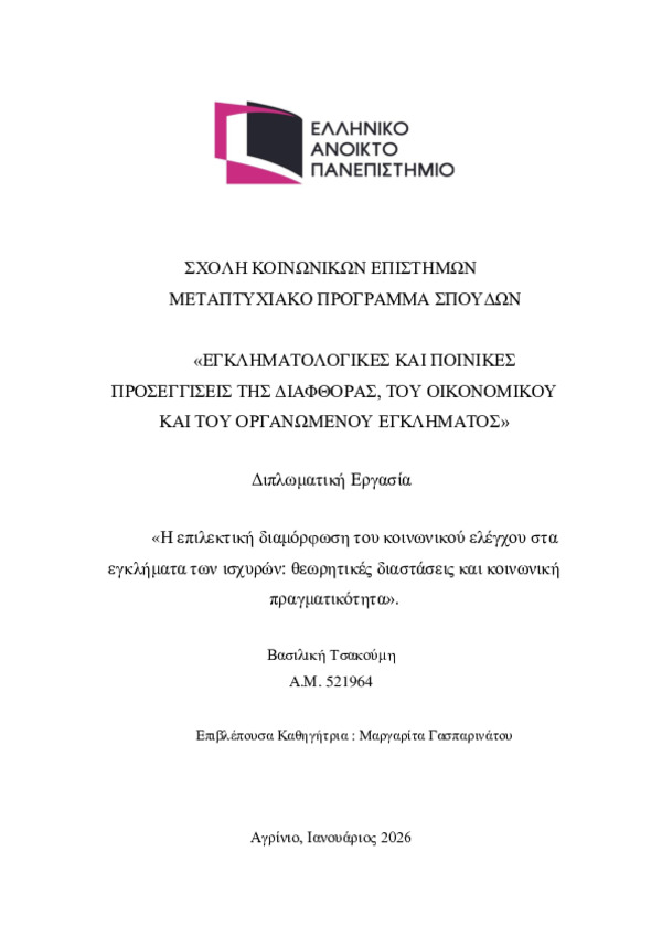 Περίληψη (Abstract): Η παρούσα διπλωματική εργασία έχει ως αντικείμενο την παρουσίαση, διερεύνηση και κριτική επισκόπηση του ζητήματος της επιλεκτικής διαμόρφωσης του τυπικού κοινωνικού ελέγχου στην περίπτωση της εγκληματικότητας των ισχυρών. Για τον σκοπό αυτόν, θα αναλυθεί το ζήτημα της επιλεκτικότητας του κοινωνικού ελέγχου υπέρ των εγκλημάτων των ισχυρών τόσο θεωρητ...