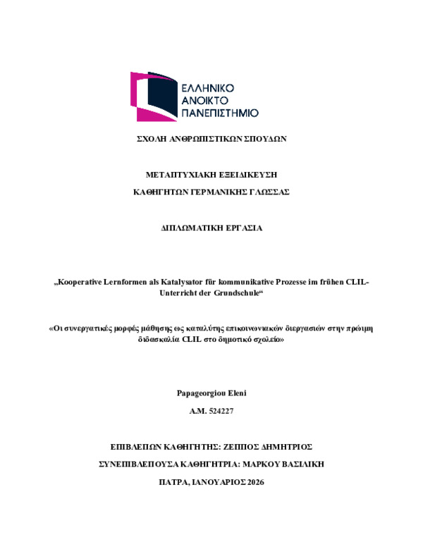 Περίληψη (Abstract): Die vorliegende Masterarbeit untersucht die Rolle kooperativer Lernformen als Katalysator für kommunikative Prozesse im frühen CLIL-Unterricht der Grundschule. Ausgangspunkt der Arbeit ist die Beobachtung, dass Content and Language Integrated Learning (CLIL) insbesondere im Primarbereich zwar ein hohes theoretisches Potenzial für authentische Sprachverwendung bietet, empirische Befunde zu konkrete...