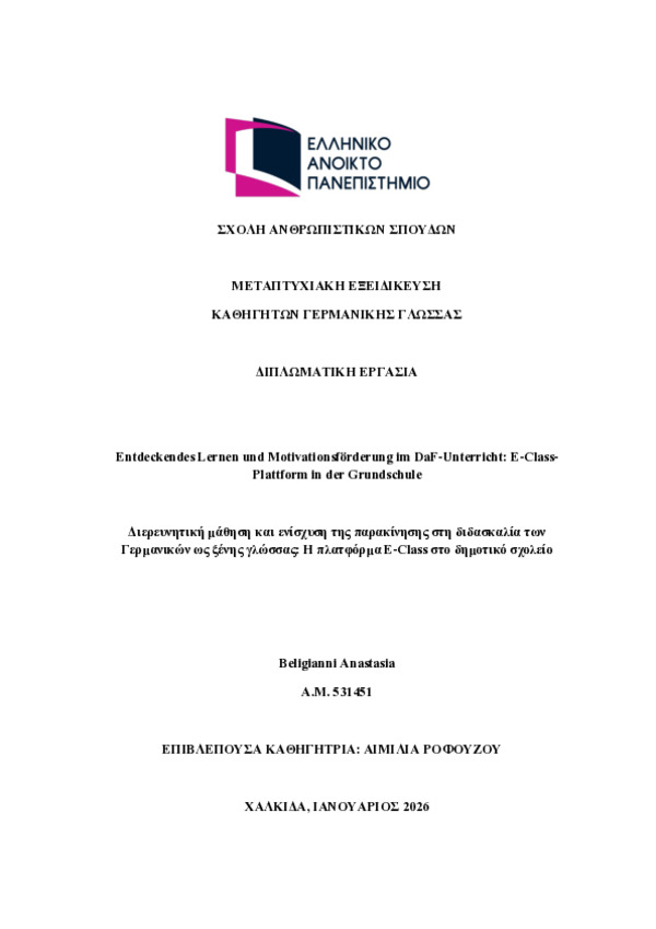 Περίληψη (Abstract): Die vorliegende Diplomarbeit untersucht die Rolle der digitalen Lernplattform E-Class im Deutsch-als-Fremdsprache-Unterricht der griechischen Primarstufe mit besonderem Fokus auf die Förderung entdeckenden Lernens und der Lernmotivation. Ausgangspunkt der Arbeit ist die Annahme, dass digitale Lernumgebungen nicht lediglich technische Hilfsmittel darstellen, sondern bei didaktisch reflektierter Nut...