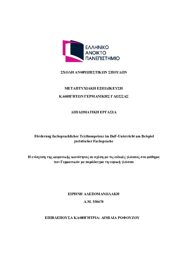 Η ενίσχυση της κειμενικής ικανότητας σε σχέση με τις ειδικές γλώσσες στο μάθημα των Γερμανικών με παράδειγμα τη νομική γλώσσα [Ελληνική]